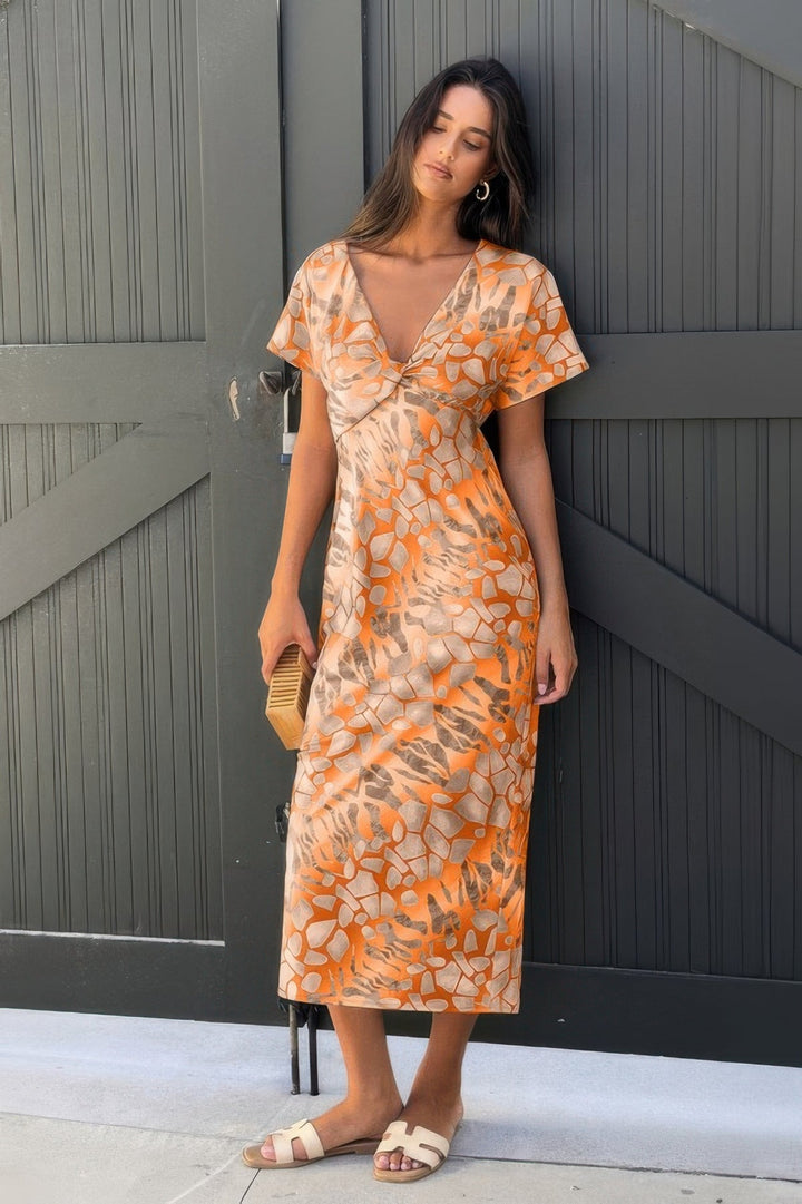 Geometric Print Twist Design Short Sleeve Fit Dress
