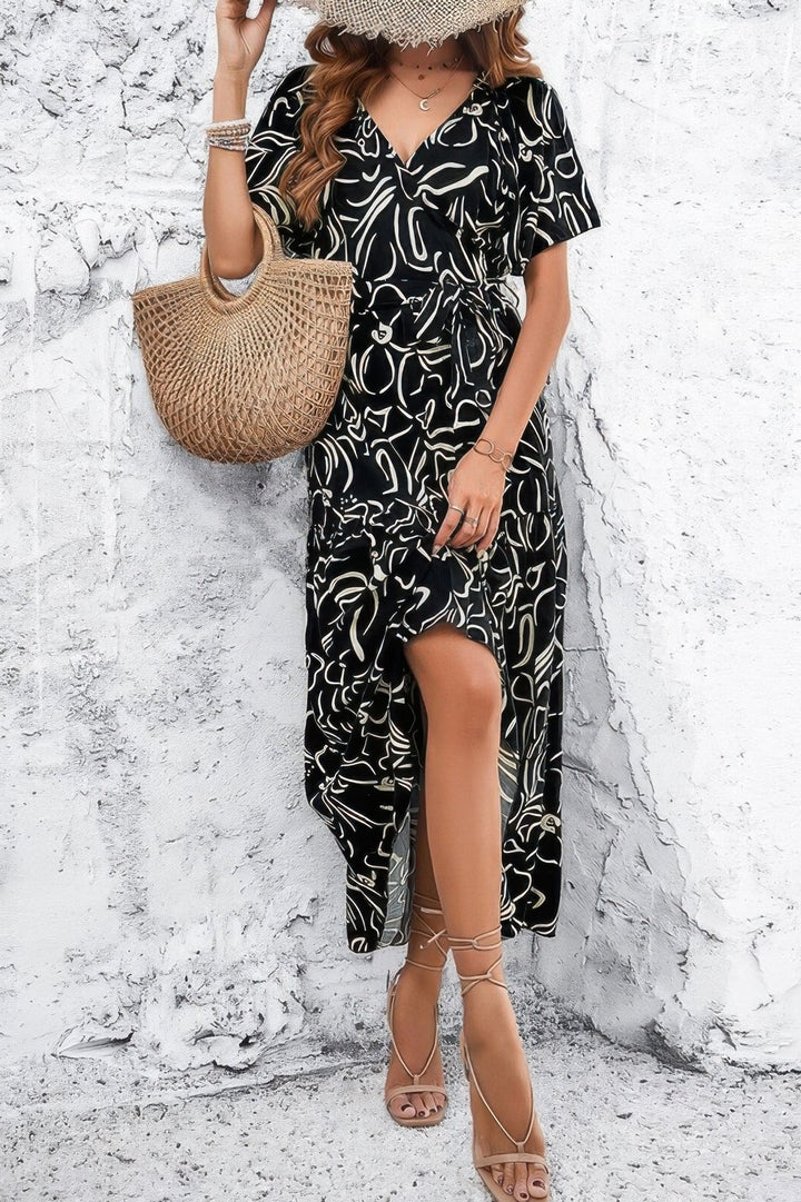 Allover Print V Neck Fit Belt A Line Long Dress