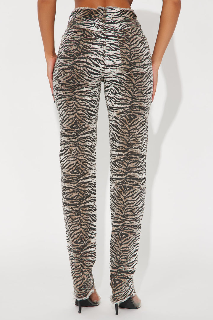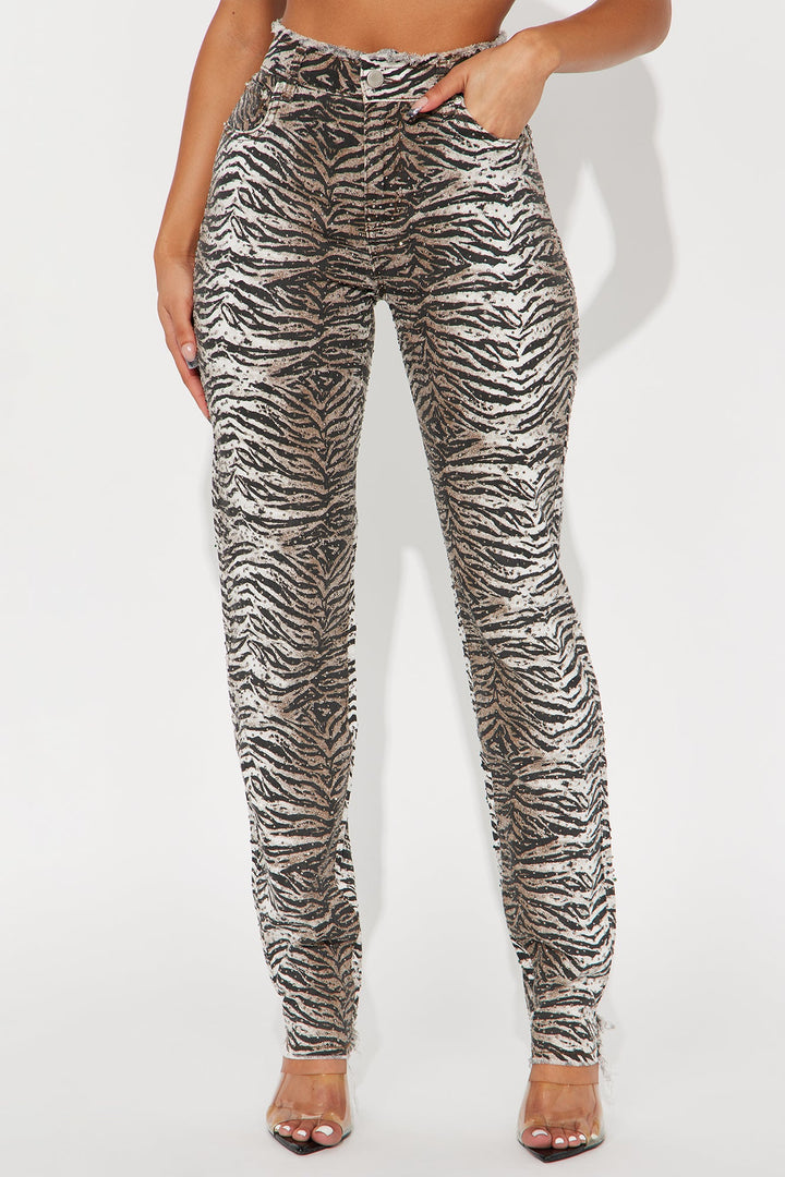 Available In Brown Combo. | Pair With Wild One Rhinestone Denim Jacket | Straight Leg Jean | 5 Pocket | Cut Off Waistband | Tiger Print | Rhinestones Front And Back | 9.5" Low Rise | 34.5" Inseam | Low Stretch Denim | Shell: 75% Cotton 23% Polyester 2% Spandex | Imported