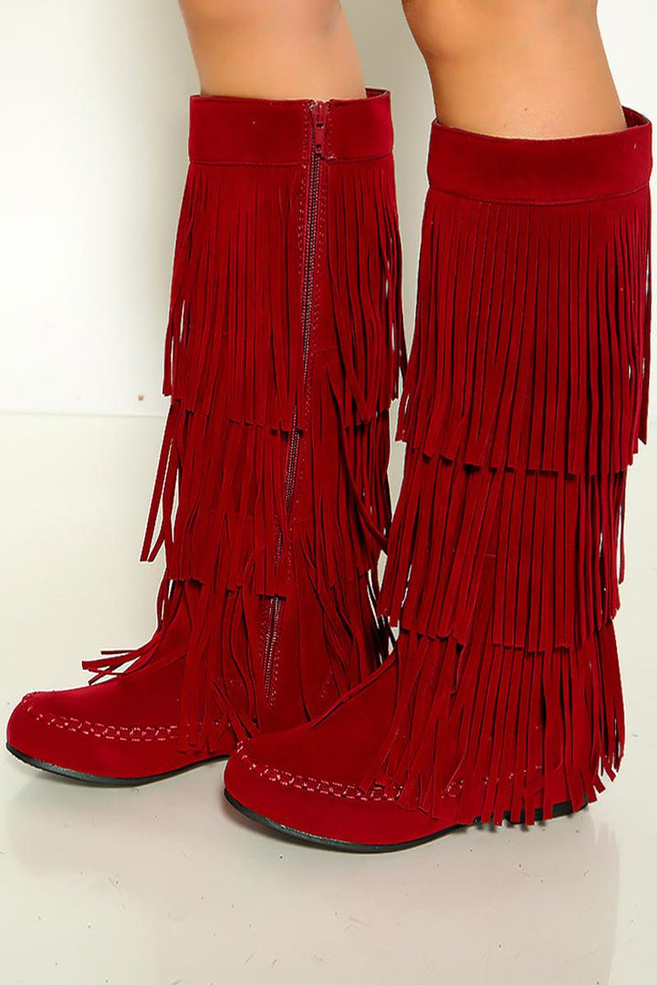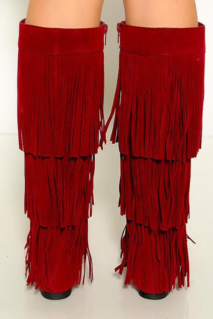 Wine Moccasin Fringe Knee High Suede Flat Boots. Featuring 3 rows of fringe
