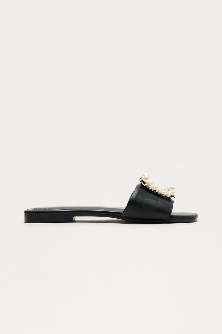 Available In Beige, Black And White. | Flat Sandals | Pearl Embellishment | Square Toe | Flat Heel | Imported