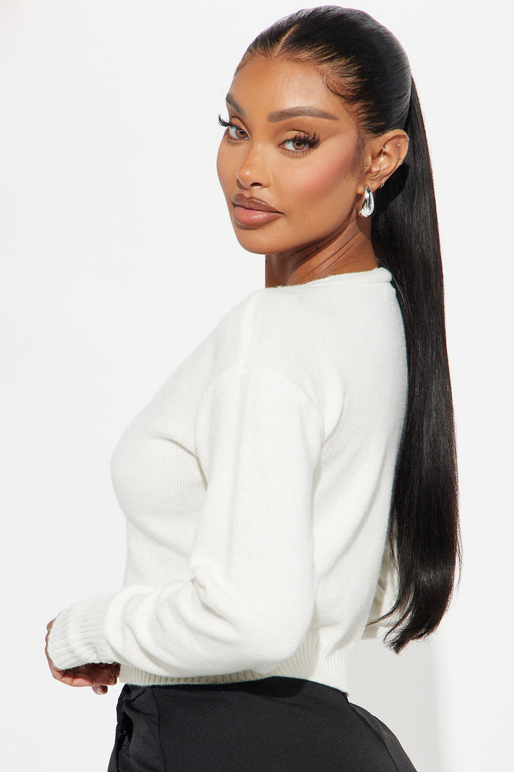 Available In Black And Ivory. | Cardigan Sweater | Pearl Bow Buttons | Long Sleeve | V Neck | Button Down | Cropped | Ribbed Hem | 88% Polyester 12% Nylon | Imported