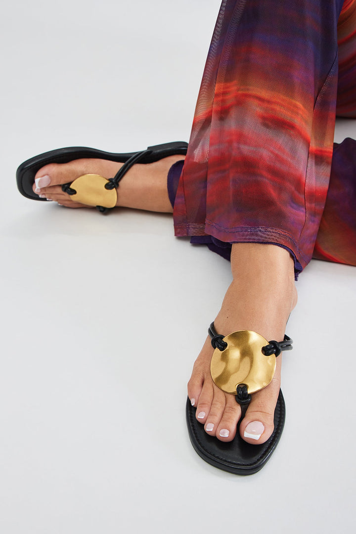 Available In Black And White. | Flat Sandals | Hardware Detail | Round Toe | Flat Heel | Imported