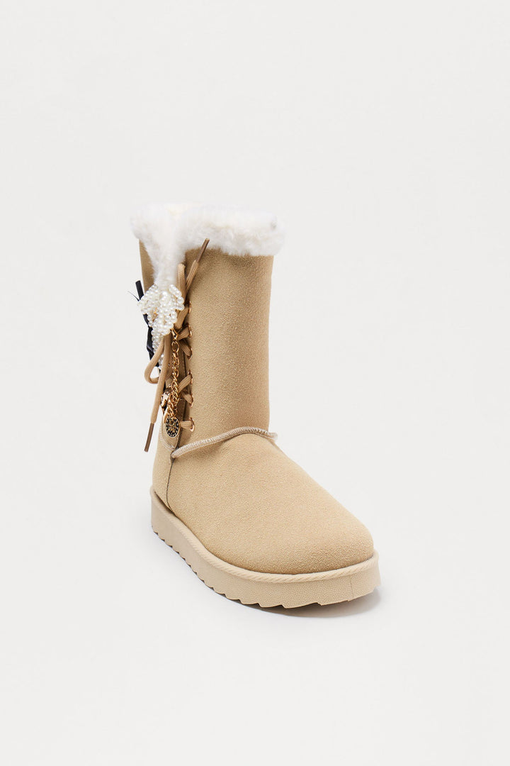 Yasmia Embellished Fur Trim Booties - Sand