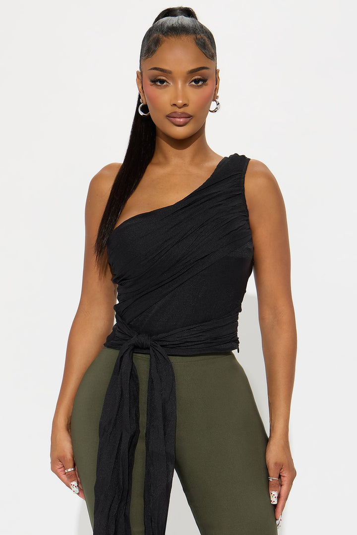 Available In Black And Blush. | Blouse | Chiffon | One Shoulder | Tie Back | Hidden Side Zipper | Fully Lined | Non Stretch | Shell- 100% Polyester | Lining- 100% Polyester | Imported
