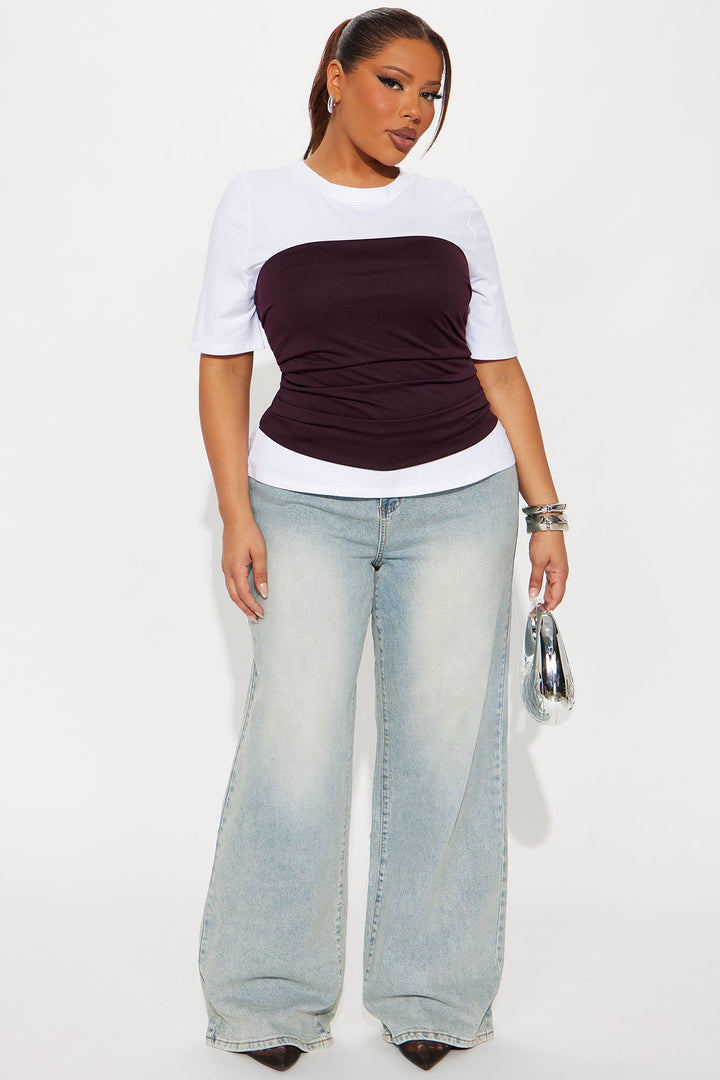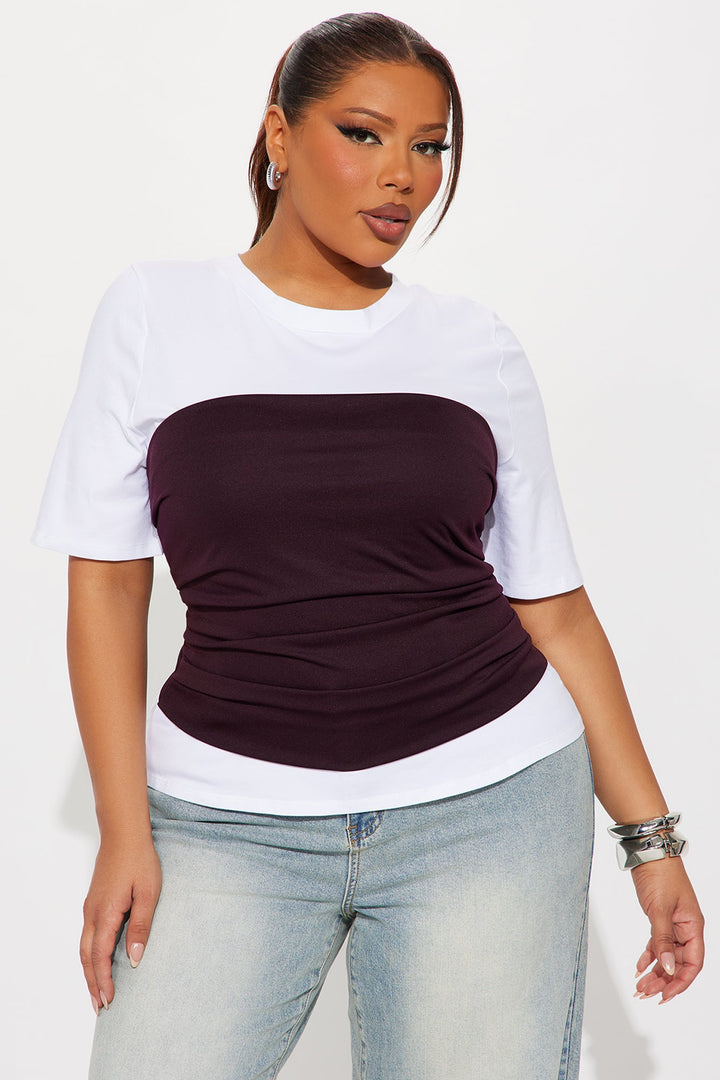 Available In White/combo. | T-Shirt | Crew Neck | Short Sleeve | Ruched | Stretch | Self: 95% Cotton 5% Spandex | Contrast: 95% Polyester 5% Spandex | Imported