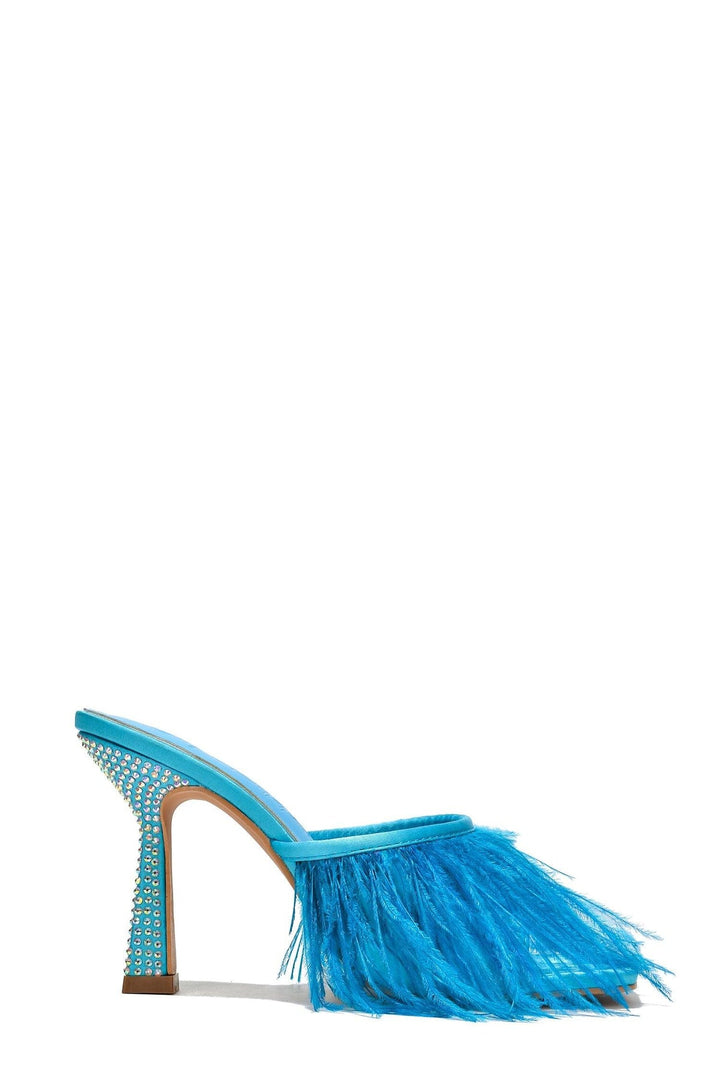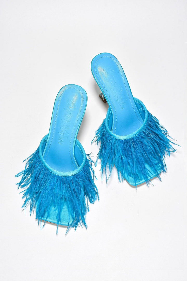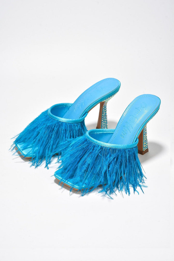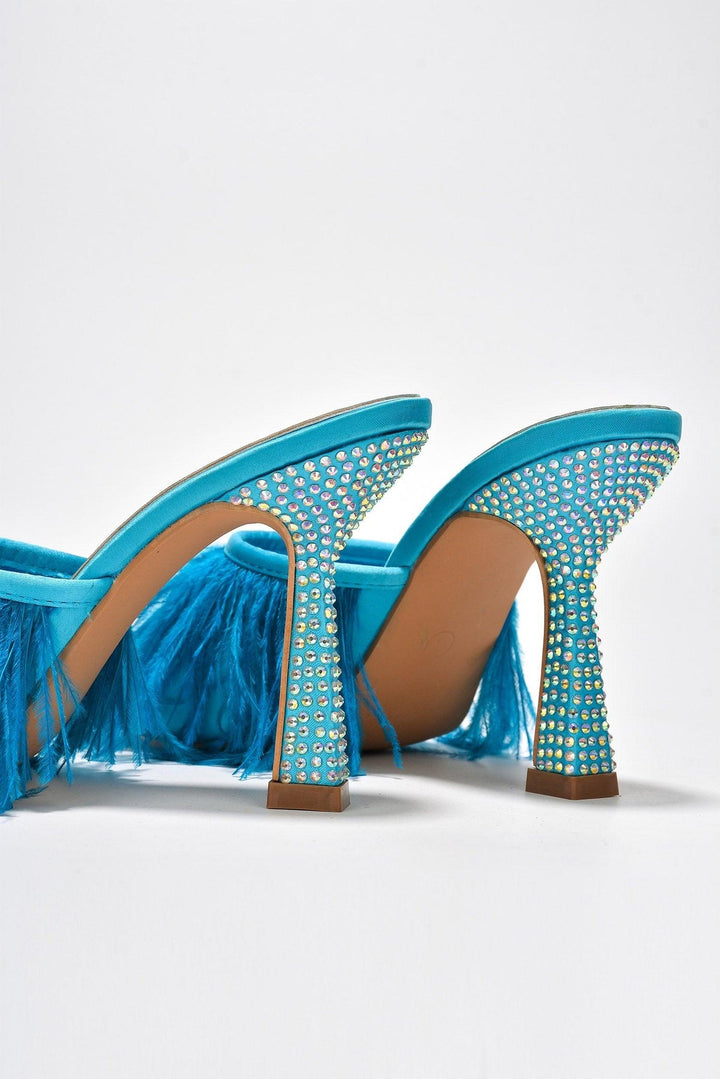 YONI - TURQUOISE - HEELS by CAPE ROBBIN rhinestone covered heels feather trim high heels open toe multicolor These fabulous Yoni high heels will be sure to make an impression! The sparkly rhinestone-coated heels and feather trim give them a unique and stylish look that will enhance any outfit.