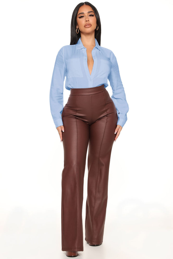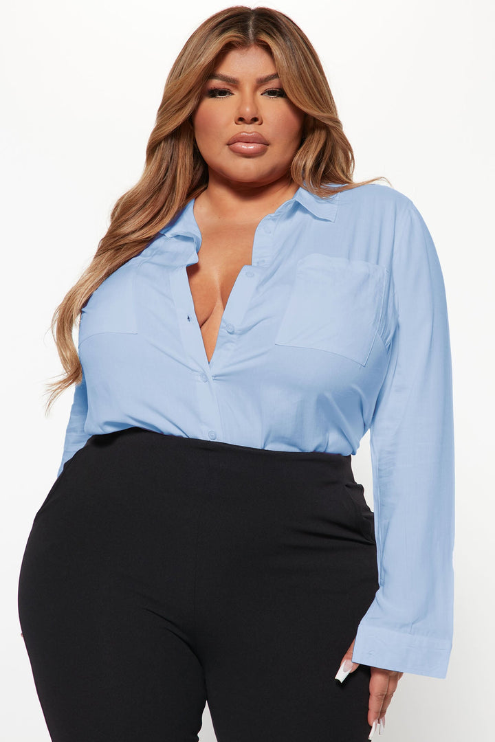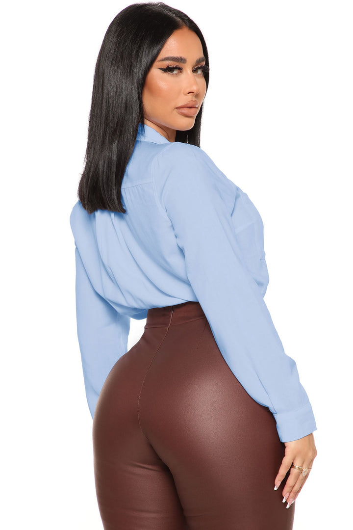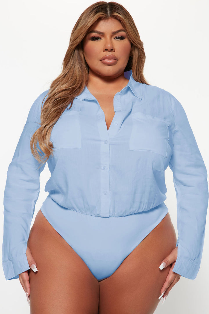 Available In Black, Blue, Blush, Chocolate, Taupe And White. | Shirt Bodysuit | Long Sleeve | Button Front | Front Pockets | Button Cuffs | Cheeky Bottom | Snap Button Closure | Final Sale | Self : 100% Rayon | Contrast : 95% Polyester, 5% Spandex | Imported