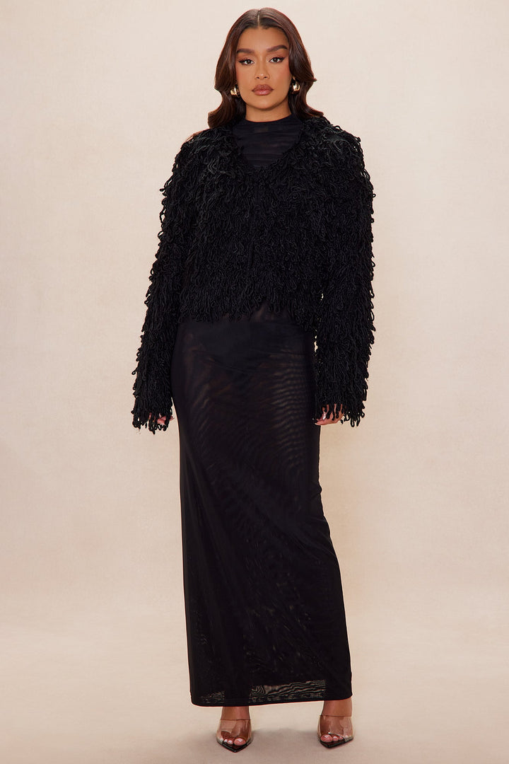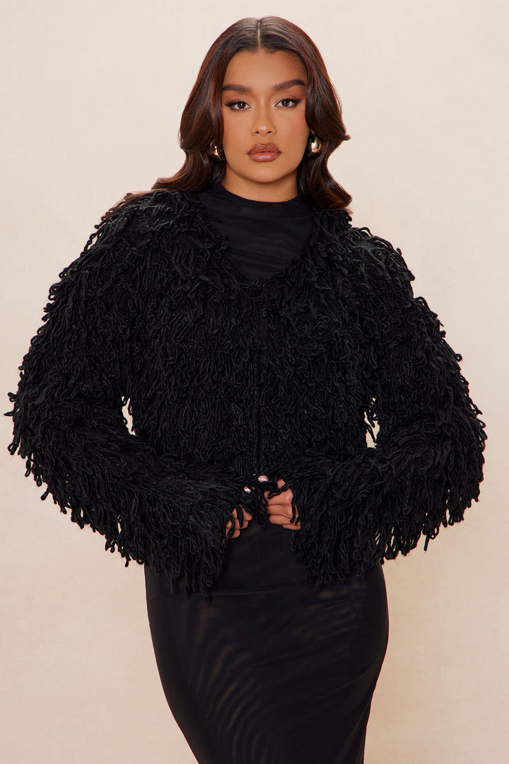 Available In Black And Mauve. | Shag Style Cardigan | Long Sleeve | Front Hook And Eye Closure | Stretch | Shell: 100% Acrylic | Imported